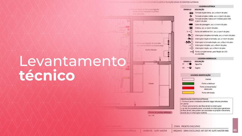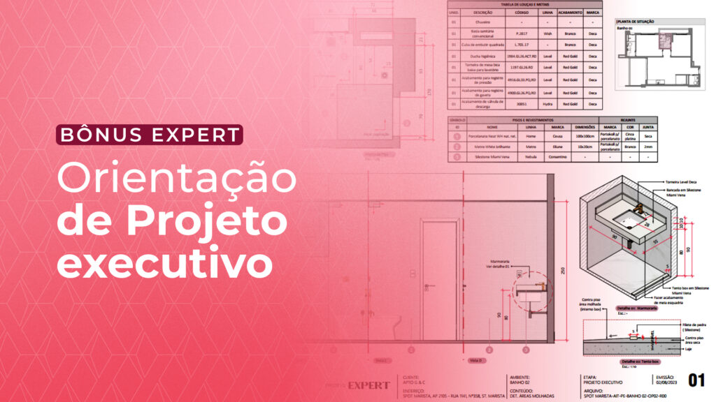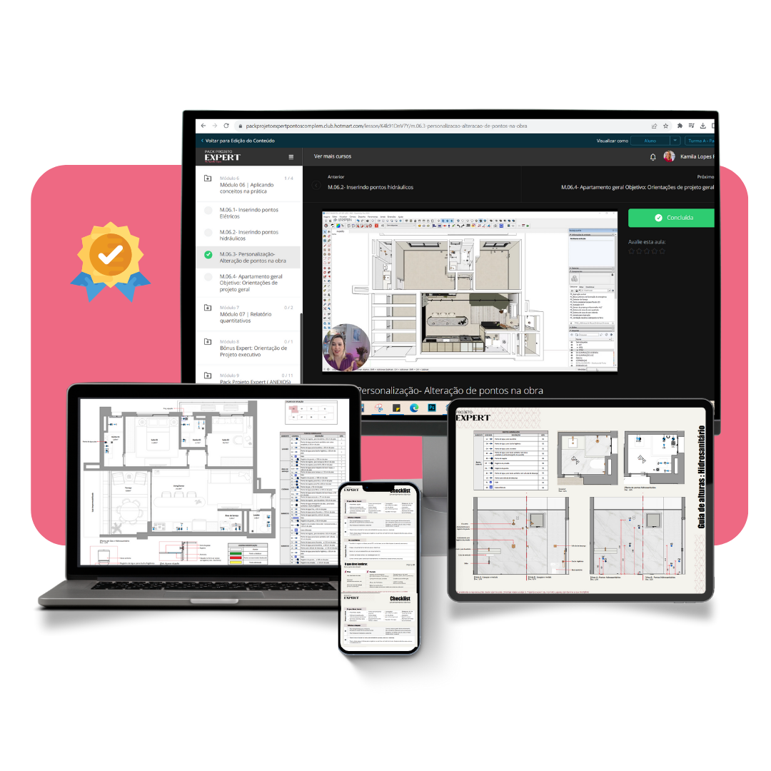 Dentro do pack, você encontra guias de alturas para consultas certeiras, aula prática de levantamento técnico, conteúdo claro de compatibilização de projetos complementares e uma planilha completa de fornecedores, além de